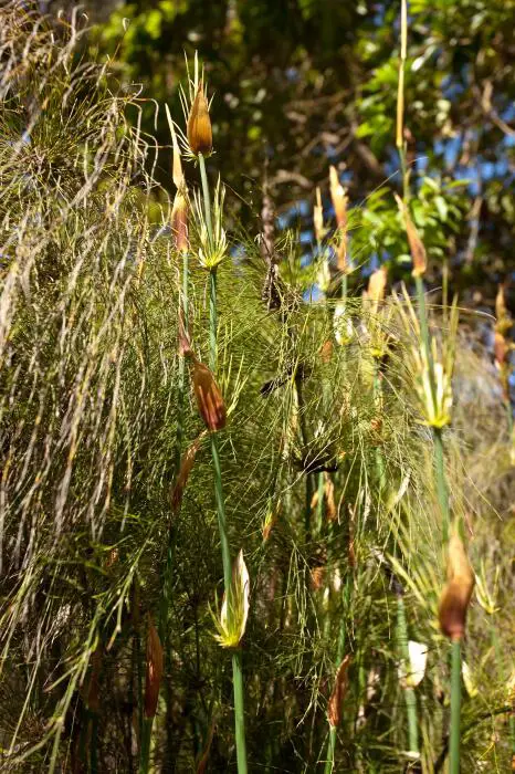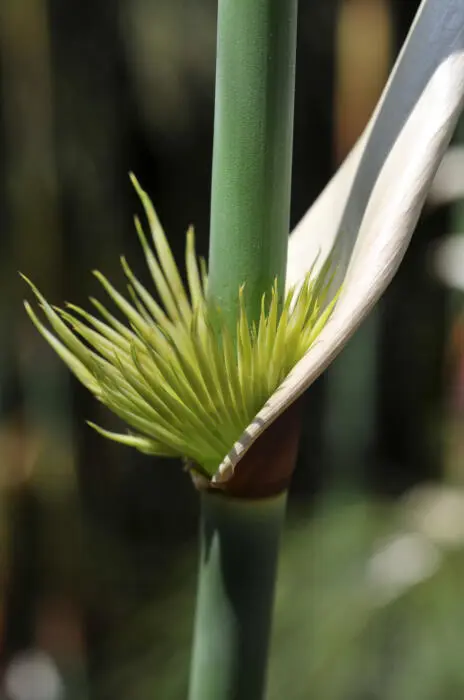 Ter hoogte van de knooppunten worden bosjes fijne, naaldachtige twijgjes gevormd. Grote papierachtige schutbladeren omhullen elke krans en geeft de plant in dit stadium een decoratieve waarde. Deze grote schutbladen produceren een zacht geritsel terwijl ze drogen.