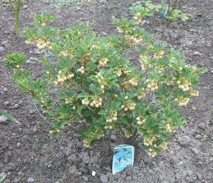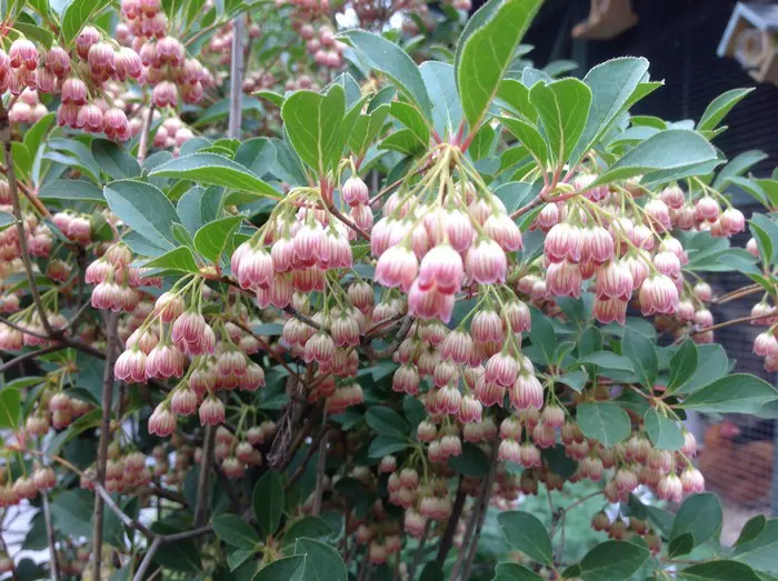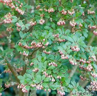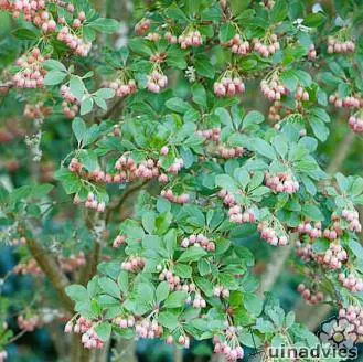 Een prachtige struik waarvan de bloei trossen urnvormige bloemen heeft.
