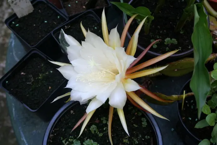 Deze schoonheid, soms koningin van de nacht genoemd, bloeit maar enkele uren, van het vallen van de avond tot de morgen, gelukkig staan er meestal 10 tot 20 bloemknoppen aan de plant.