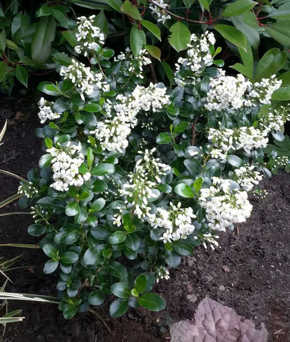 Bloeit zeer rijkelijk met trosjes van witte buisvormige bloempjes.