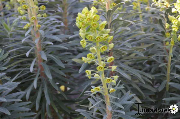 Euphorbia characias 'Black Pearl' heeft een zeer originele bloei in het voorjaar met grote trossen van geelgroene bloemen met een zwart hart.