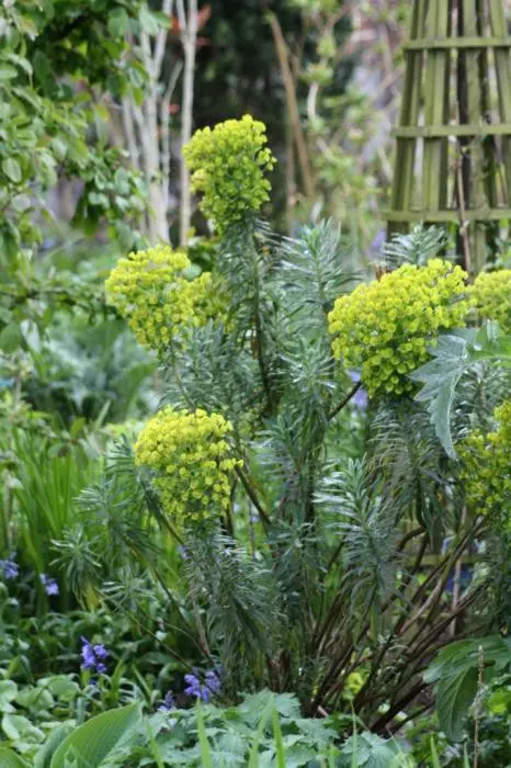 Euphorbia characias heeft een opvallende bloeiwijze en is ook decoratief door de blauwgroene lijnvormige bladeren.