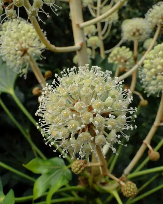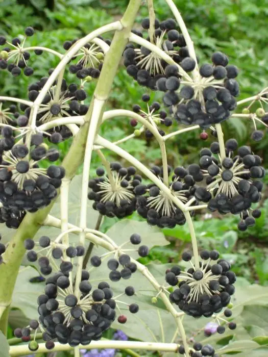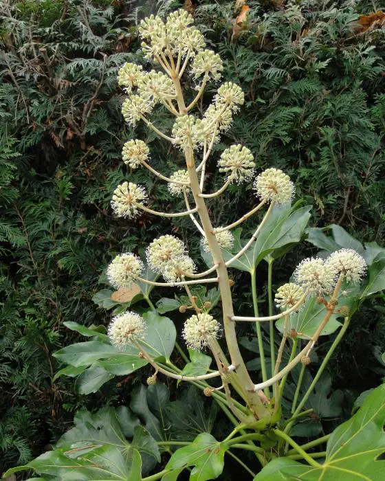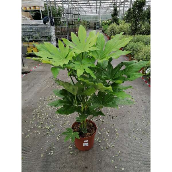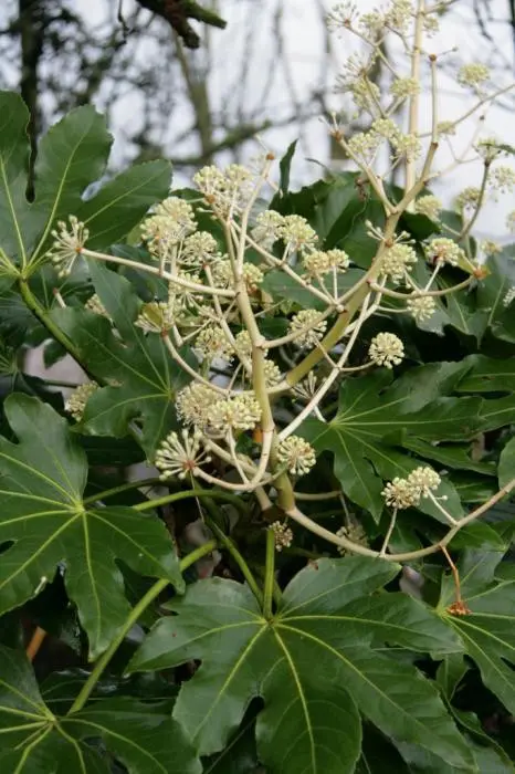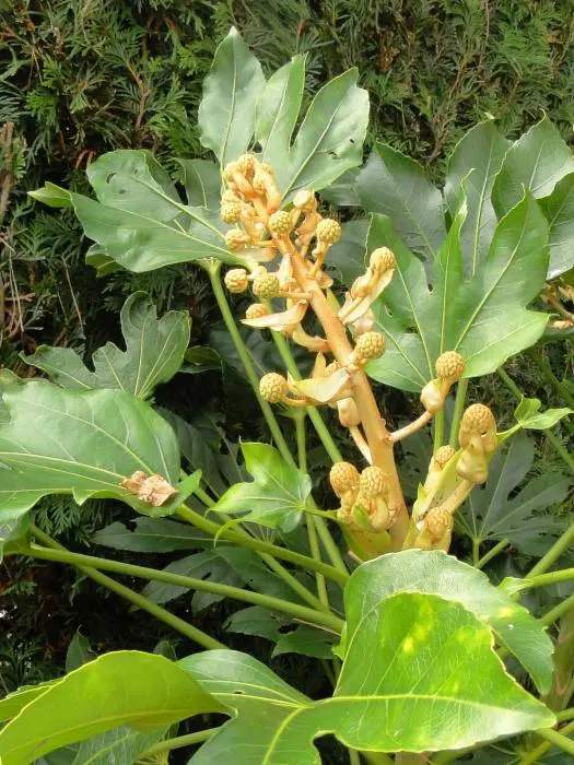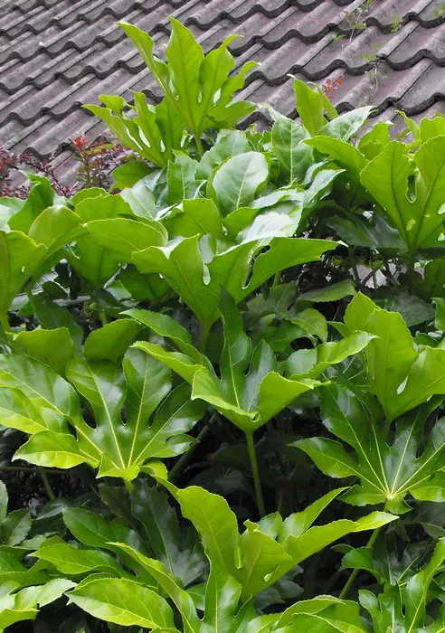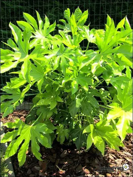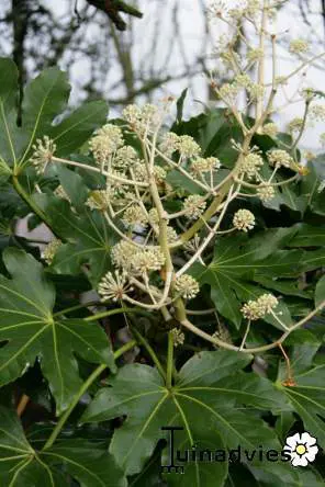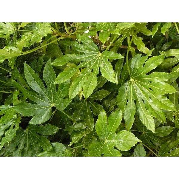 Fatsia japonica is een snelgroeiende plant met gelobd, glanzend groen blad. Heeft grote bladeren van 15 tot 30 cm breed aan een even lange steel. Oudere planten bloeien soms met trossen van kleine roomwitte pompons. gevolgd door aantrekkelijke zwarte ronde vruchten. De kleine bloemen verschijnen in de herfst, ze zijn gegroepeerd in trossen kleine witte pompons .