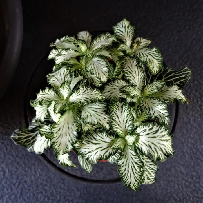 Fittonia albivenis (Verschaffeltii Group) 'White Forest Flame' is een klein kamerplantje met aantrekkelijke, bontgekleurde wit/groene blaadjes.