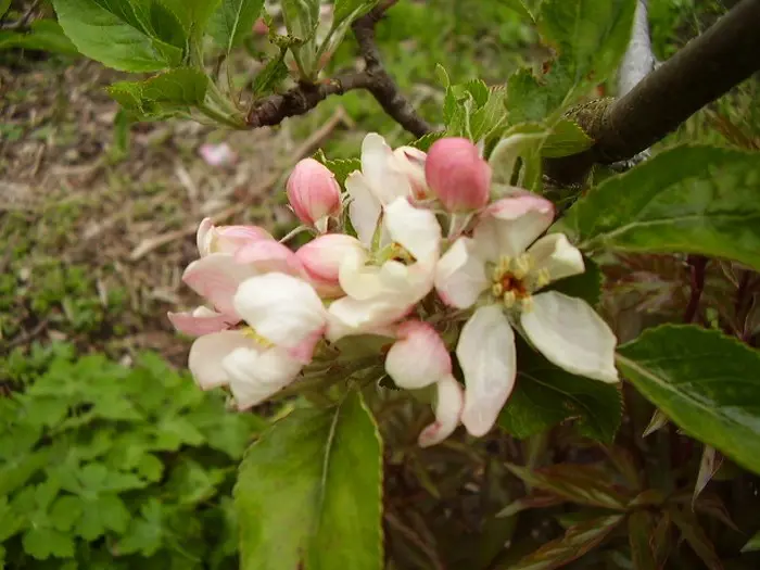 Malus domestica 'Cox's Orange Pippin' bloeit vroeg in mei met witroze bloesems