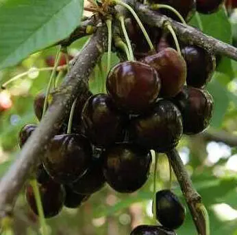 Prunus avium 'Bigarreau Noir' produceert donkerrode, bijna zwarte kersen met een zeer sappige zoete smaak en rozerood vruchtvlees.
