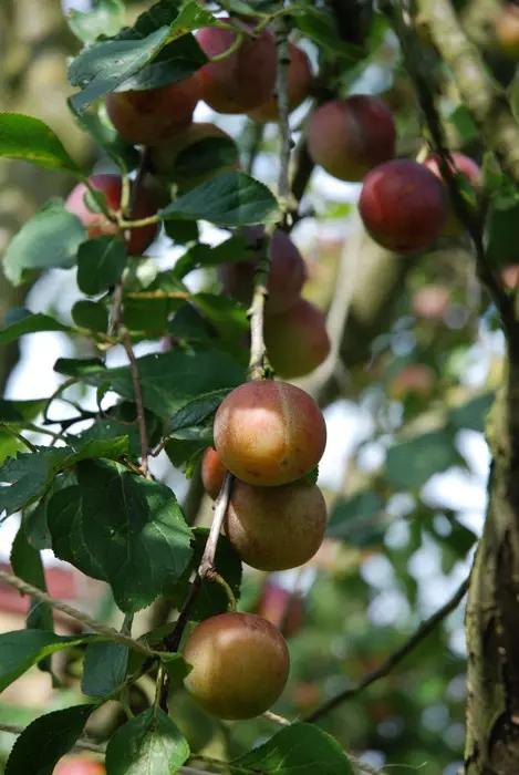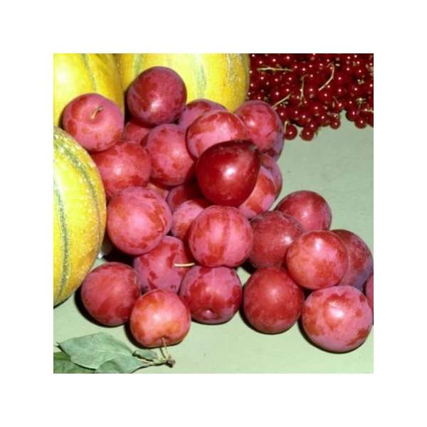 Prunus domestica 'Reine Claude d'Althan' is een ronde vrucht met roodpaarse kleur, geel vruchtvlees met een zeer goede smaak.
