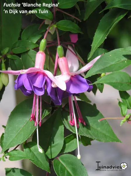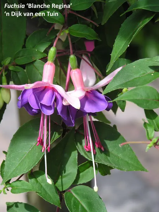 Fuchsia 'Blanche Regina' is een halfhangende bellenplant met dubbele bloemen.