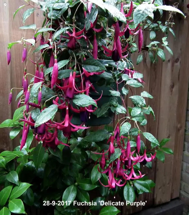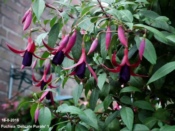 Fuchsia 'Delicate Purple' is een bellenplant met grote enkelvoudige bloemen. De bloem heeft een roodpaarse buis en kelkblaadjes en een paarse kroon.