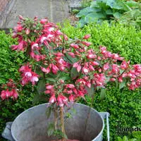 Opgaande fuchsia met rozerode kroon en roze kelk.