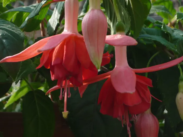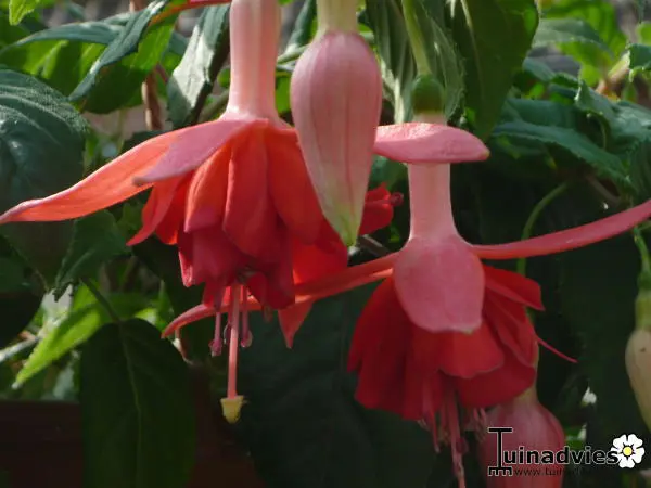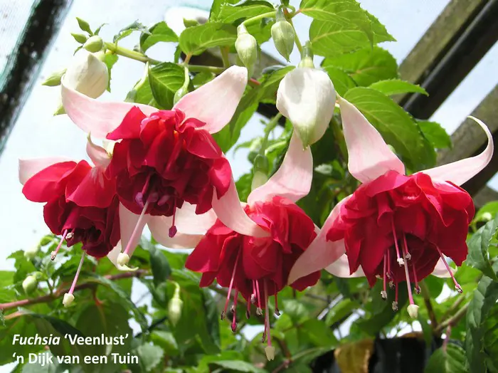 Fuchsia 'Veenlust' is een dubbelbloemige hangende fuchsia met cremewitte kelkblaadjes.
