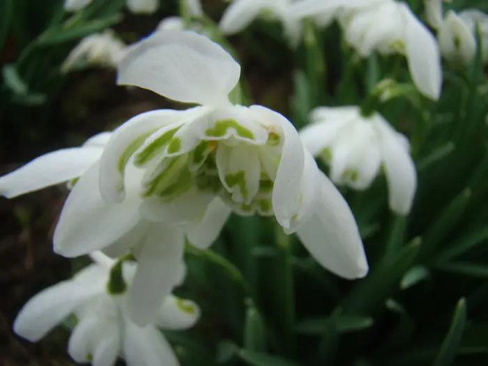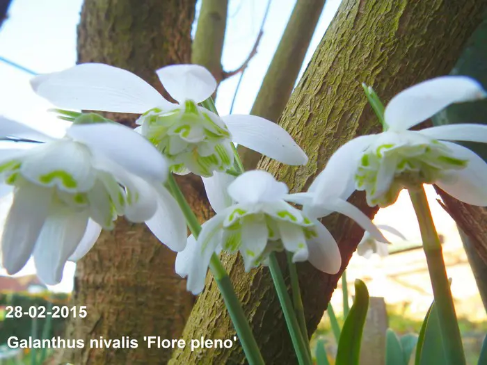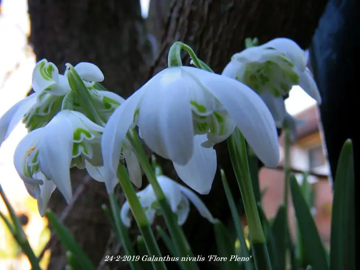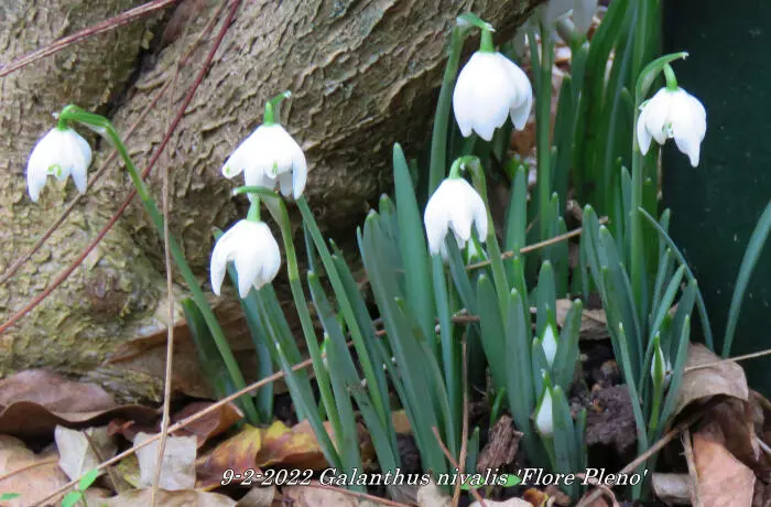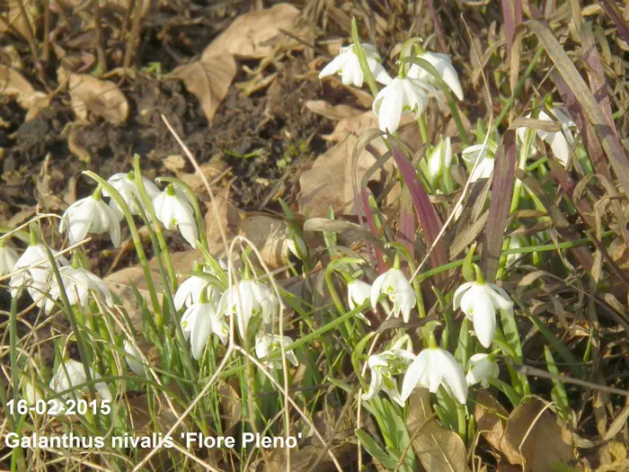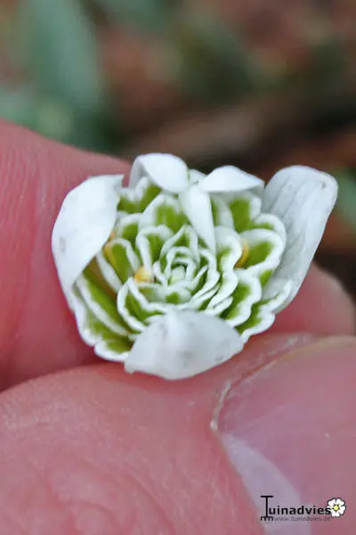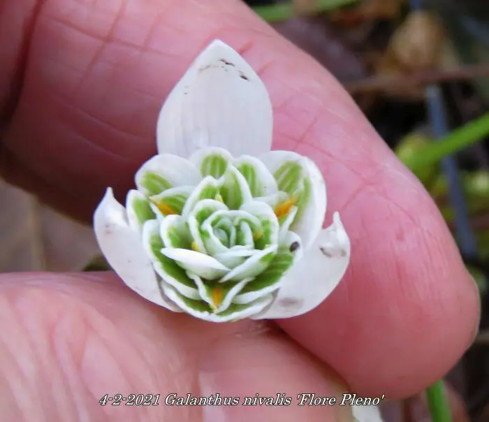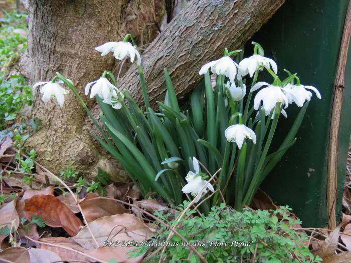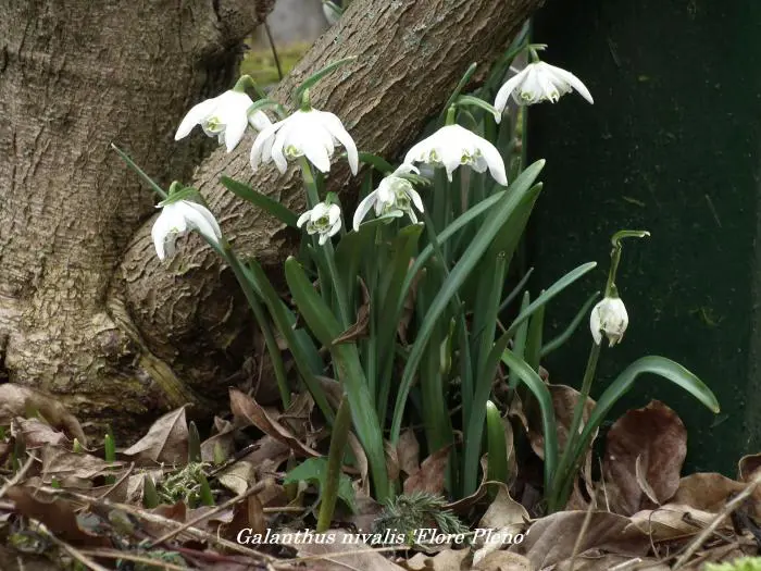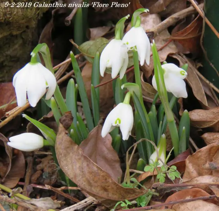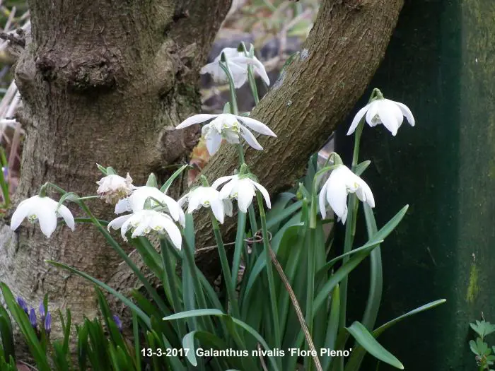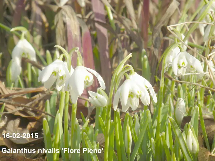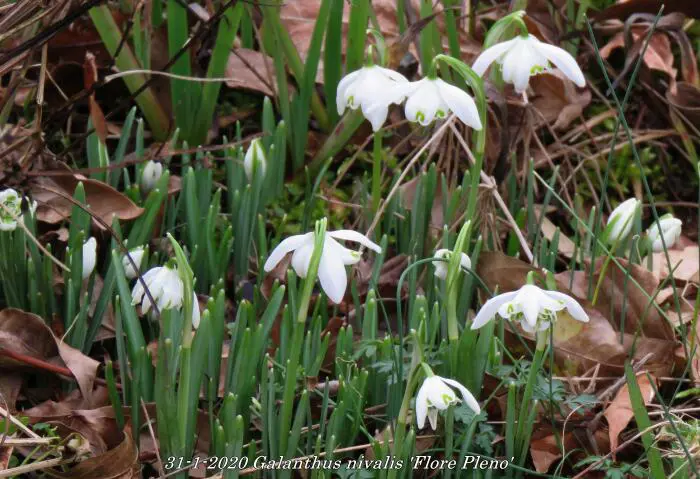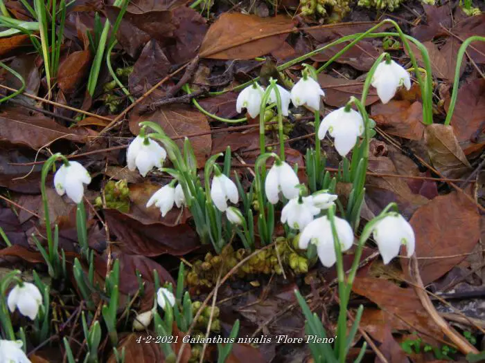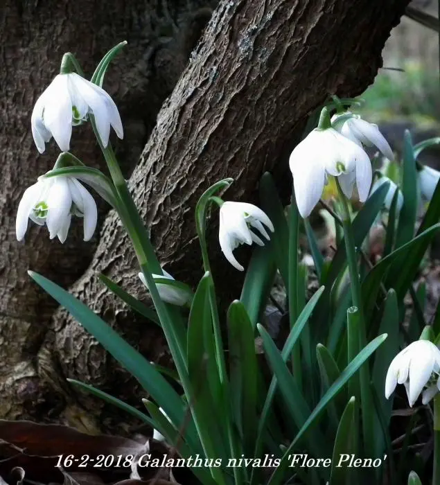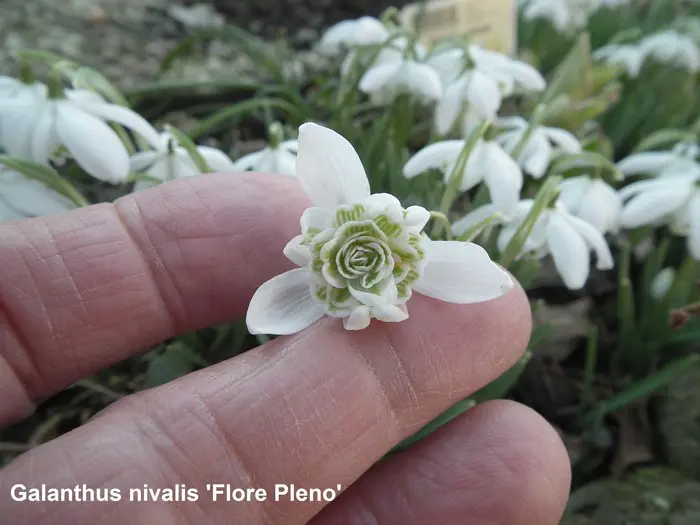 Galanthus nivalis 'Flore Pleno' is een dubbelbloemige vorm van het sneeuwklokje en een krachtig en levendig bolgewasje met hangende, witte bloemen met een lichtgroene markering in het centrum.