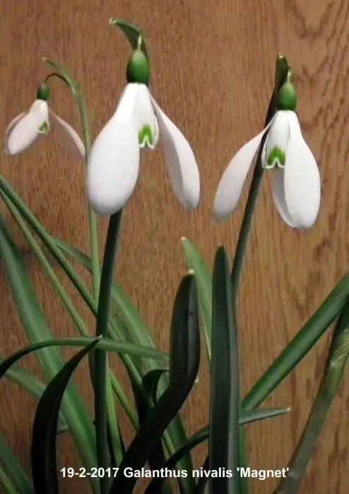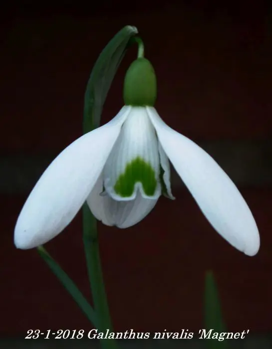 Galanthus nivalis 'Magnet' bloeit met witte hangende klokjes met een groene vlek op de 3 binnenste dekbloemblaadjes. Het bijzondere aan deze cultivar is een langer hangertje (steeltje) waaraan de bloem hangt.
