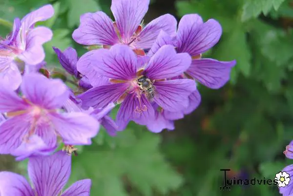 Bloeit rijkelijk met donkergeaderde, violetpaarse bloemen iets roder in het centrum.