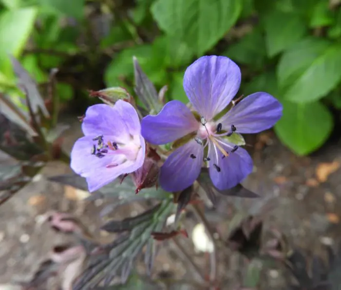 In de vroege zomer bloeien de kleine paars-lavendelblauwe bloemen die prachtig combineren met de donkere bladeren.