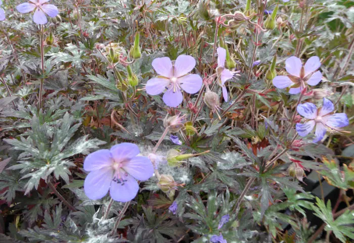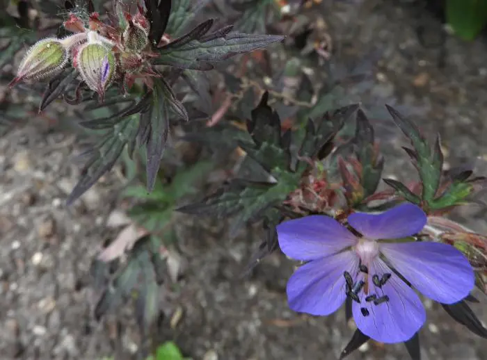 Geranium pratense 'Hocus Pocus' is een aantrekkelijke variëteit met een compacte groeiwijze met diep ingesneden bronspaarse bladeren.