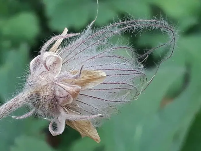 Geum triflorum bloeit met knikkende ronde, zachtgele bloemen met paarsroze schutbladeren. Maar het meest opvallendste zijn de prachtige zaaddozen na de bloei. Lijken op sierlijke vederlichte zilver-paarsroze pluimen. De bloemen bloeien per drie aan de top van een paarse stengel.
