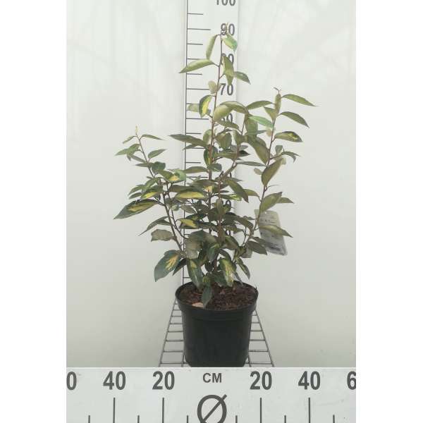 De bladvorm van de Elaeagnus x ebbingei 'Limelight' lijkt op die van de olijfboom, groot en glanzend leerachtig, ovaal blad, geelbont met een grijze onderkant.