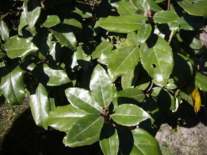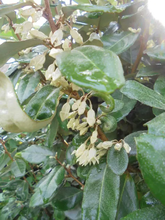 De bladvorm van de Elaeagnus x ebbingei lijkt op die van de olijfboom, groot en glanzend leerachtig, ovaal blad met een grijze onderkant.