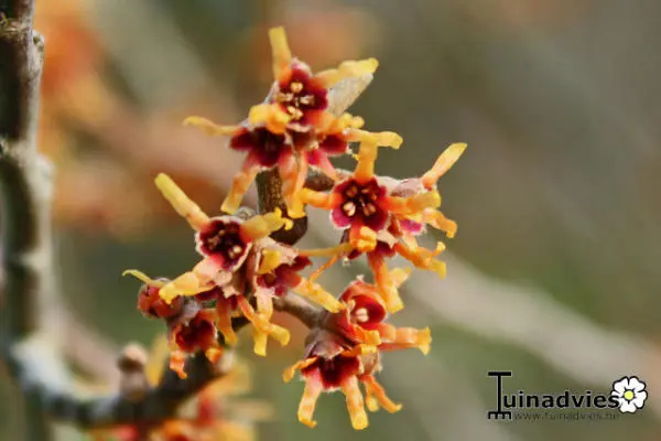 Hamamelis vernalis bloeit met zeer zoet geurende, goudgele/bronsrode bloemen op kale takken.
