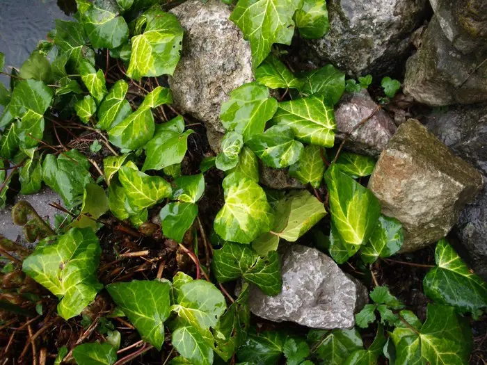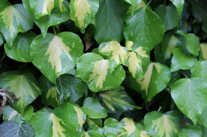 Deze klimop heeft groen blad met een gele vlek in het centrum.
