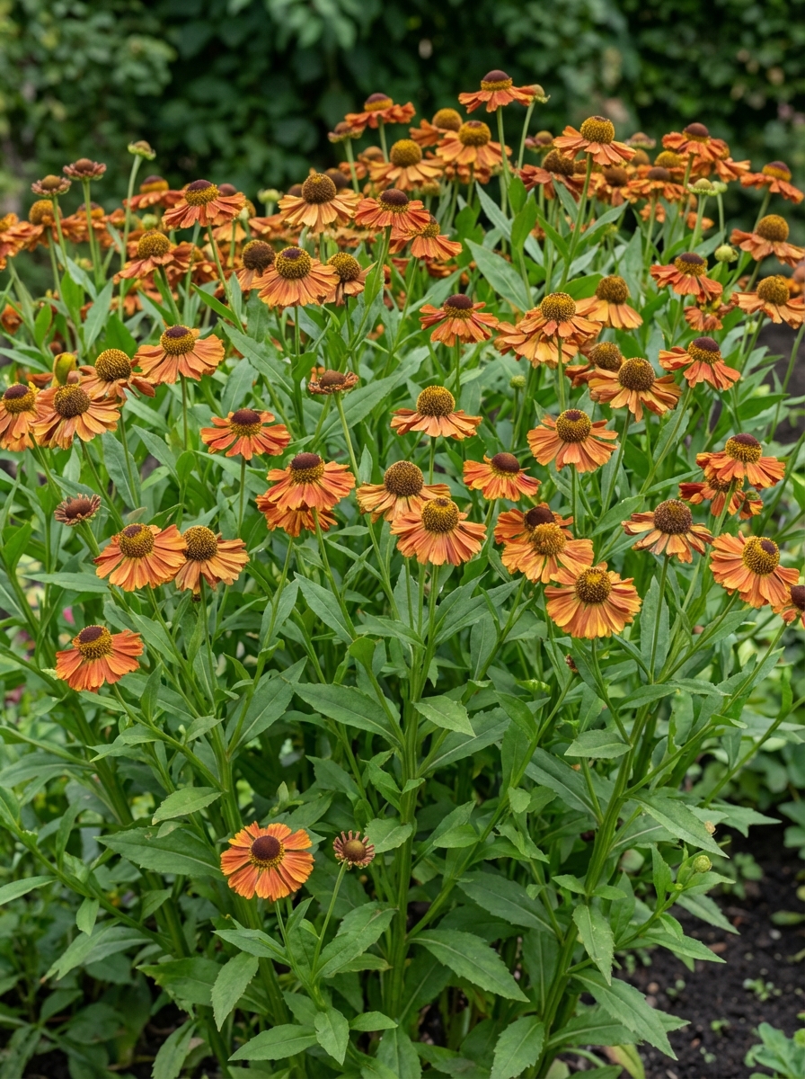 Helenium hybr. 'Waltraut' bloeit met grote bloemen van een flamboyante fel oranje kleur die geleidelijk vervaagt aan de randen van de bloembladen om een geeloranje kleur aan te nemen.