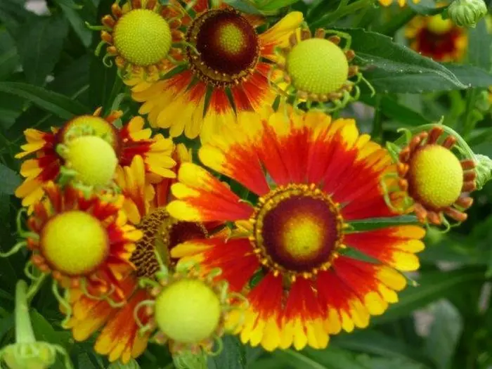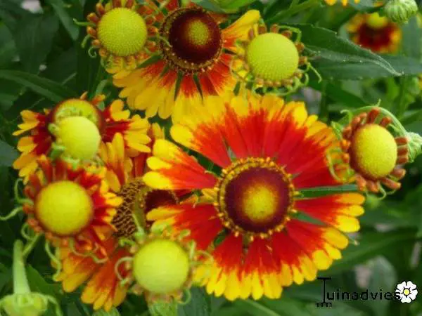 Helenium autumnale 'Rotgold' bloeit later dan de meeste Helenium's met grote bloemen van een flamboyante kleur van geel tot goud, oranje, rood en brons. Prachtig al die kleuren op dezelfde plant.