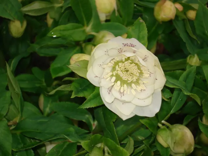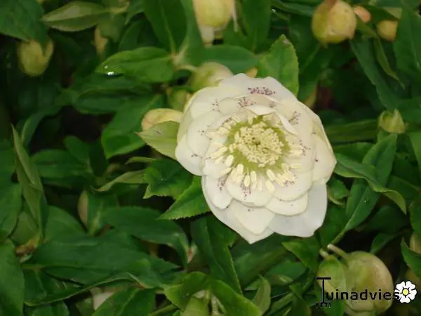 Helleborus orientalis 'Double White Spotted' is dubbelbloemig waarvan de witte bloemblaadjes roodpaars gespikkeld zijn.