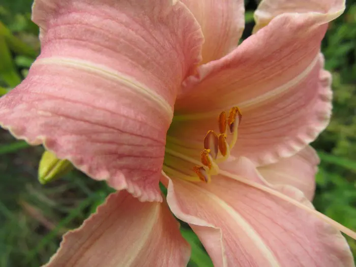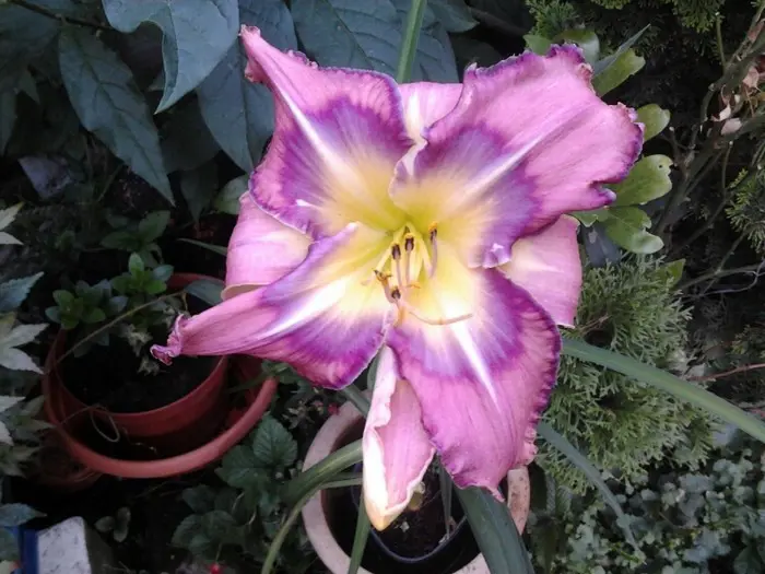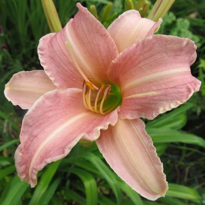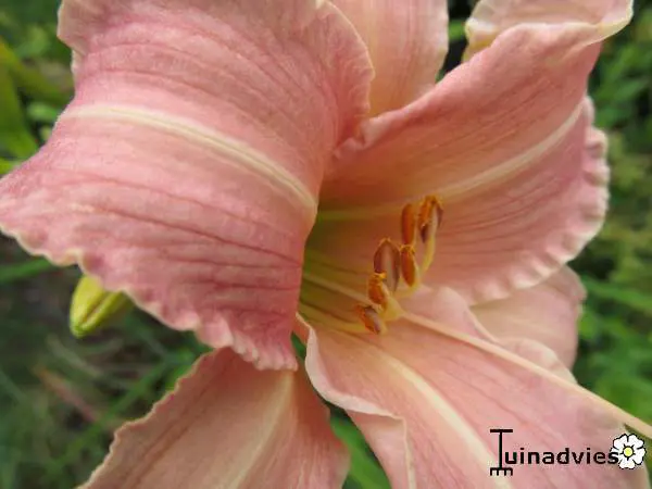 Hemerocallis 'Childrens Festival' bloeit roze met goudgele keel en een brede witte streep op de bloemblaadjes.