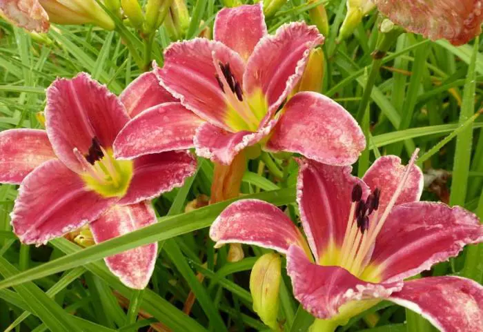 Hemerocallis 'Startle' bloeit wijnrood met een cremekleurige rand en een groengele keel.