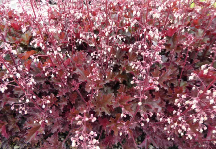 Heuchera 'Crimson Curls' bloeit cremewit. Het blad is bronsgroen/bruin met gekroesde randen waardoor de karmijnrode onderkant zichtbaar wordt.