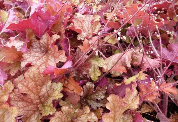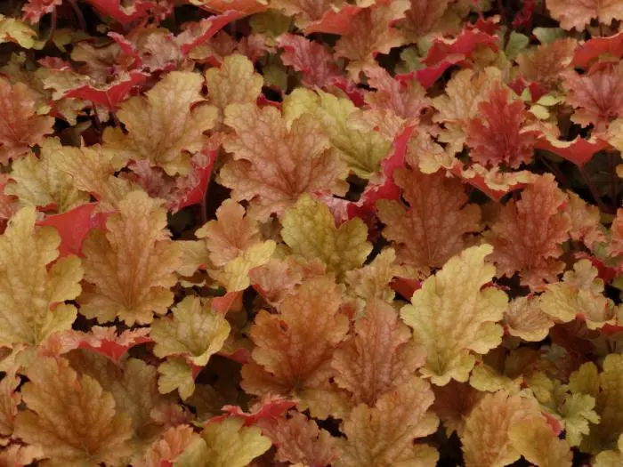 De bladeren van Heuchera 'Ginger Peach' zijn erg decoratief, oranjeroze en gefranjerd.