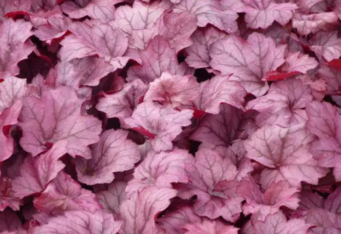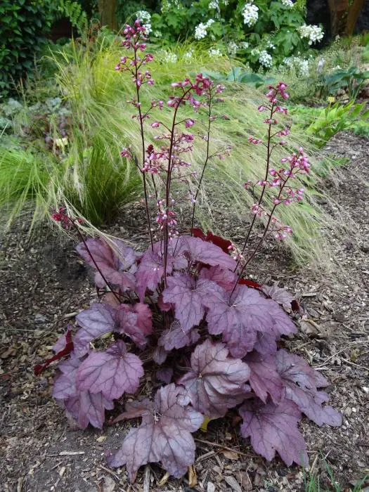 Heuchera 'Georgia Plum' is een mutatie van H. 'Georgia Peach' maar heeft een meer compacte groeiwijze, kleinere bladeren en bloemen. Het blad is zilverachtig lilapaars en de bloemen paarsroze.