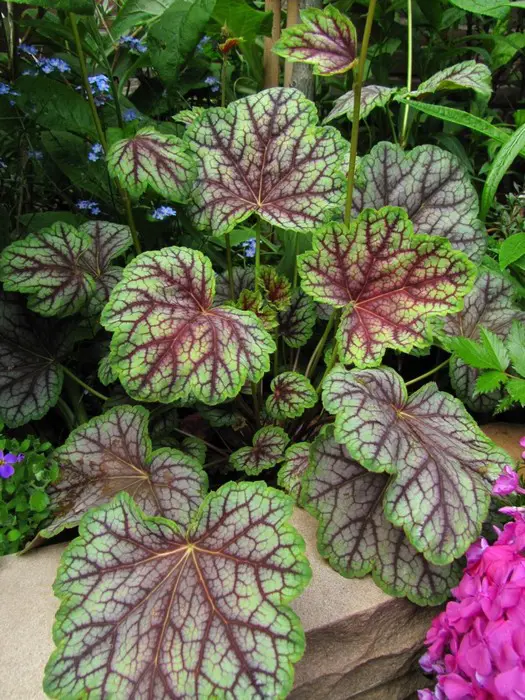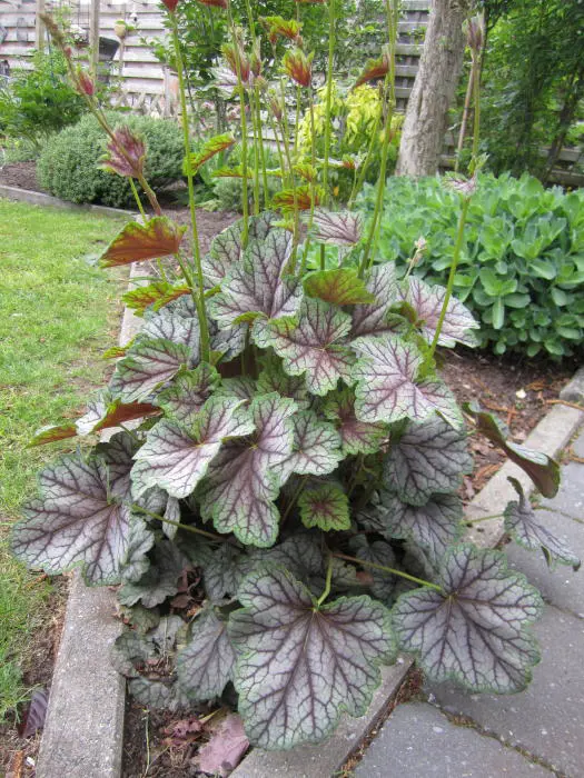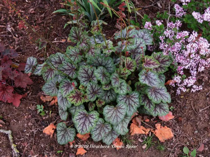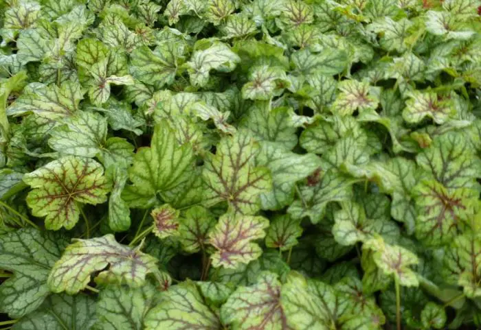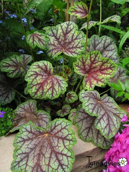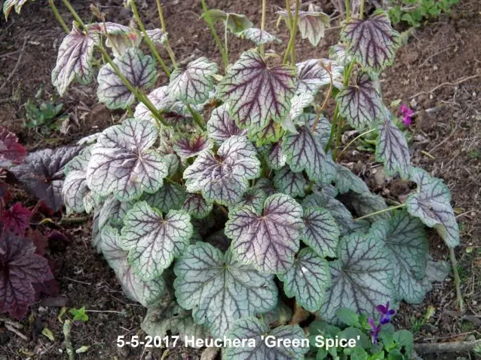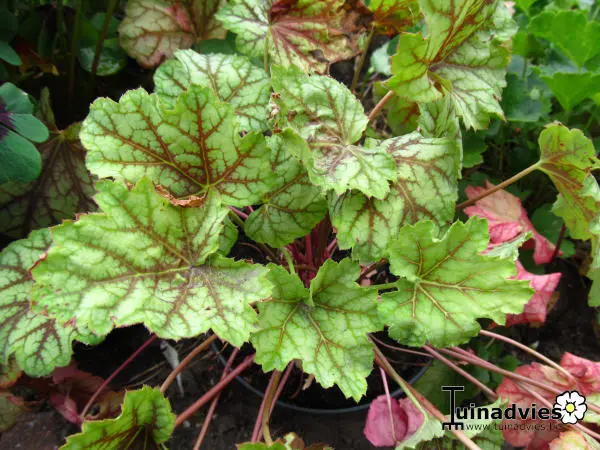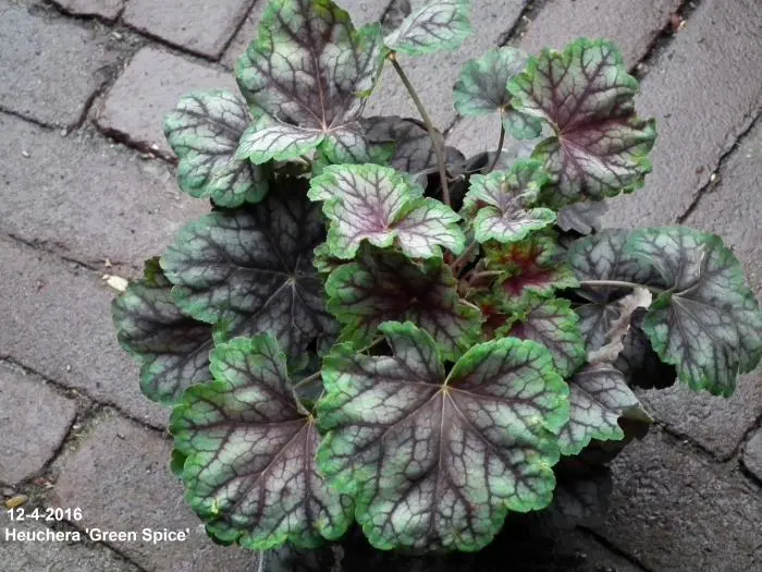 Heuchera 'Green Spice' heeft een erg opvallend bont blad van groen en wit met paarse nerven.