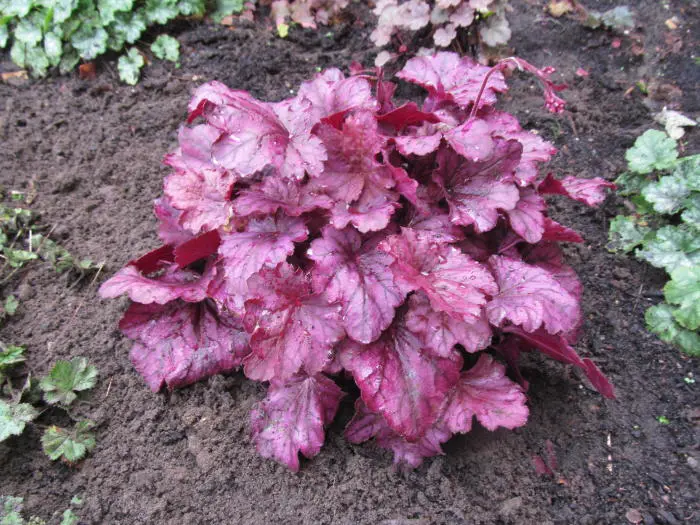 Heuchera 'Wild Rose' krijgt zeer aantrekkelijke paarsroze bladeren met donkergrijze nerven.