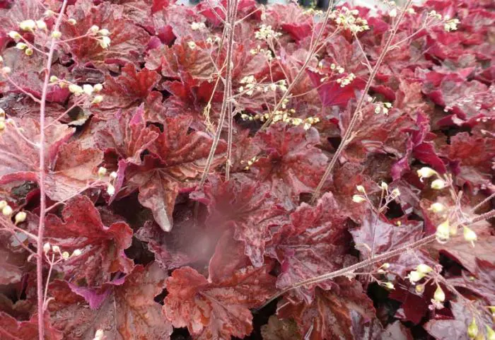 Heuchera 'Mocha' heeft grote, donker bruinrode bladeren en cremewitte bloeipluimen.