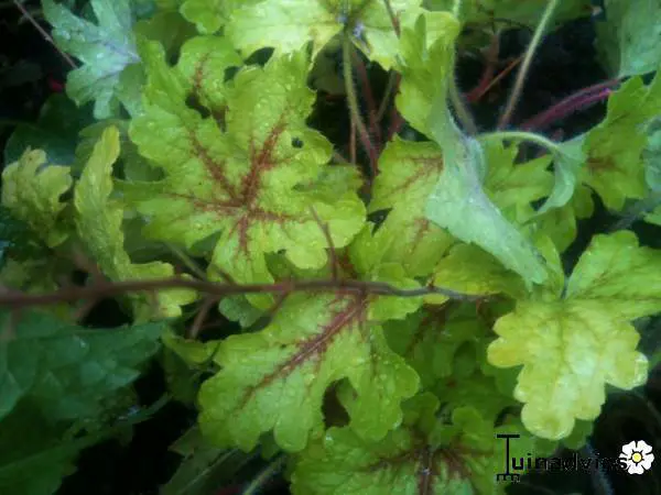 'Stoplight' heeft een helder geelgroen blad met opvallende rode nerven. In de zomer worden de bladeren groener.