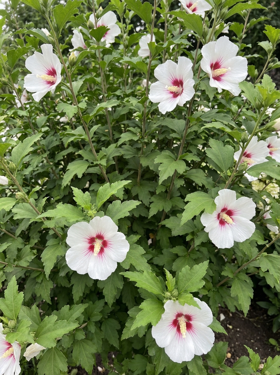 Hibiscus syriacus ’Red heart’ is een rechtopstaande heester met een compacte groeiwijze en donkergroene bladeren die in het najaar geel verkleuren.