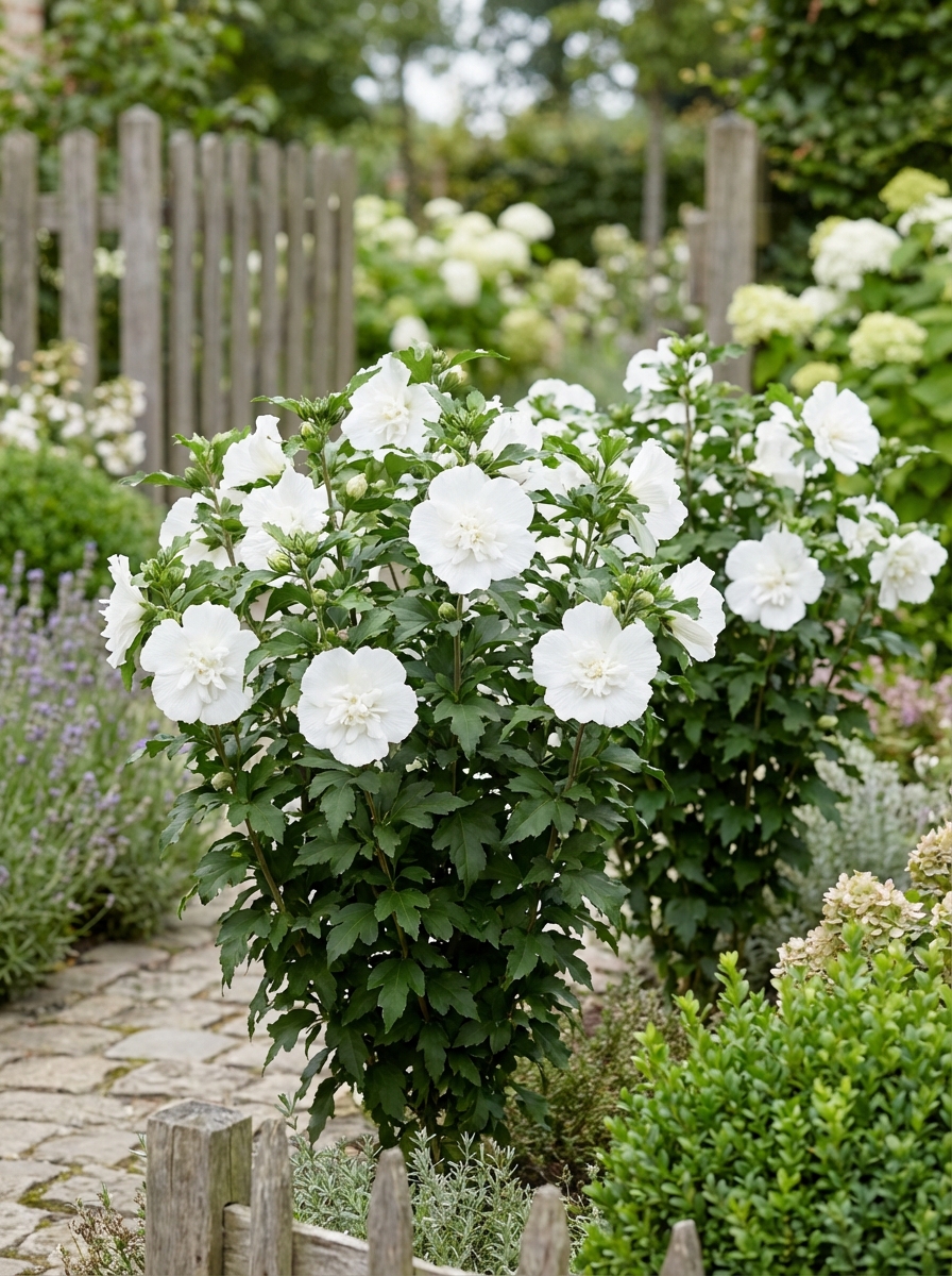 Hibiscus syriacus 'White Chiffon' is een rechtopstaande heester met een compacte groeiwijze en donkergroene bladeren die in het najaar geel verkleuren.