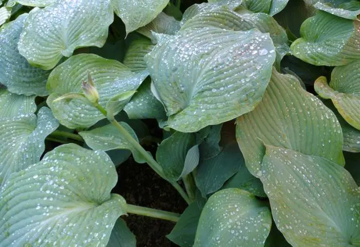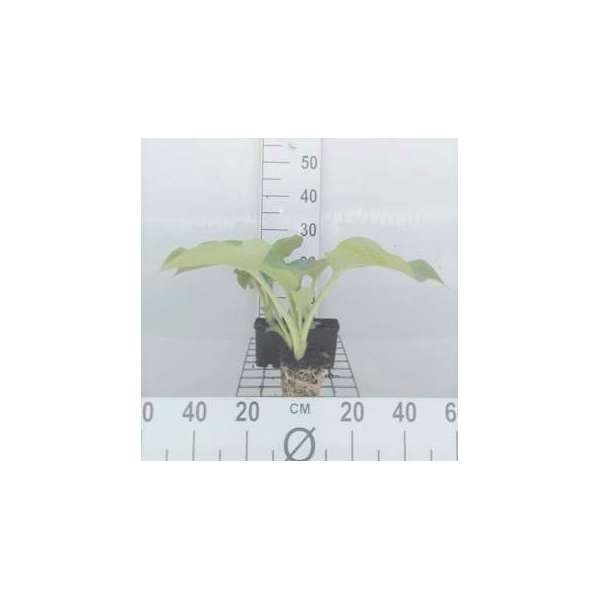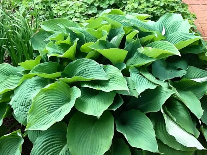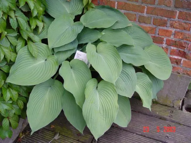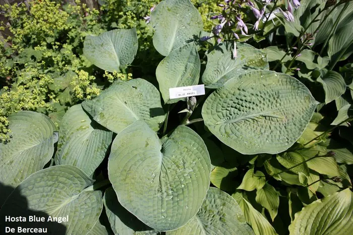 Hosta 'Blue Angel' heeft een erg groot blauwgroen blad met witte bloemen.
