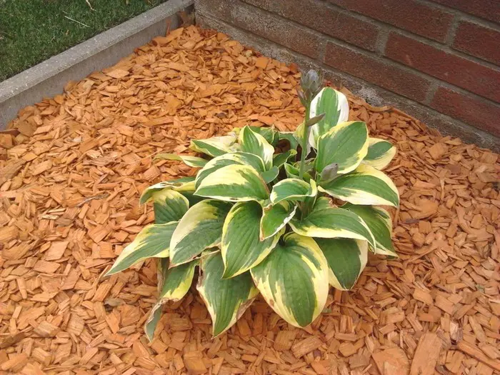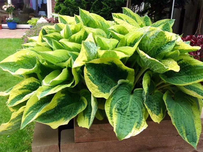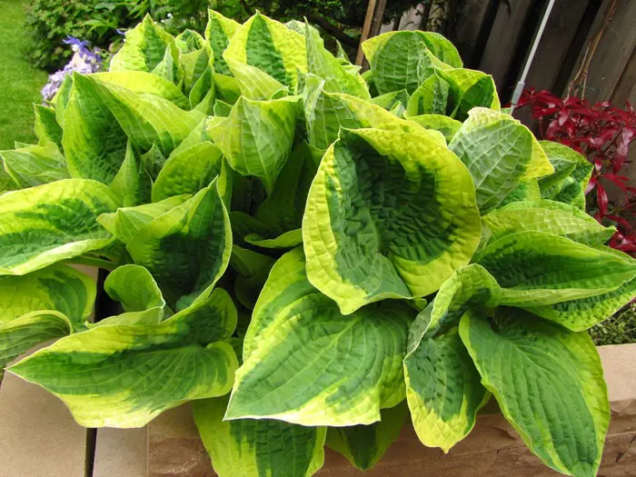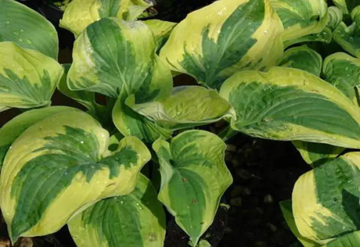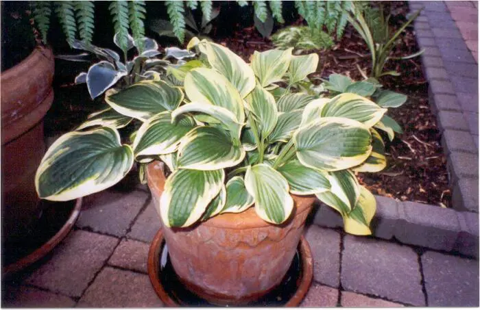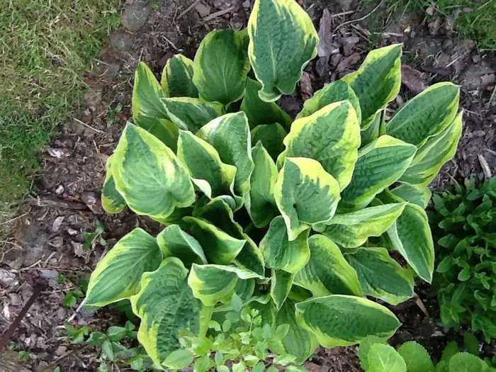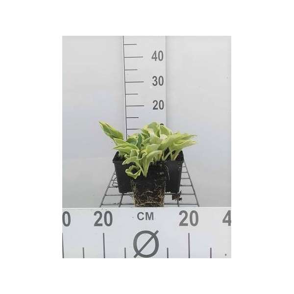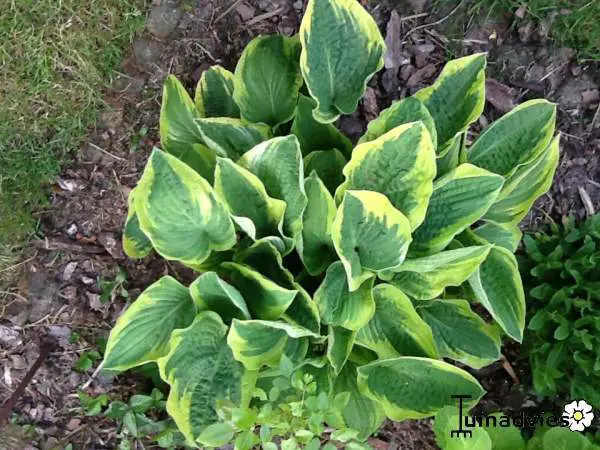 Hosta 'Wide Brim' heeft een hartvormige groen blad met een brede gele rand dat later wit verkleurt.