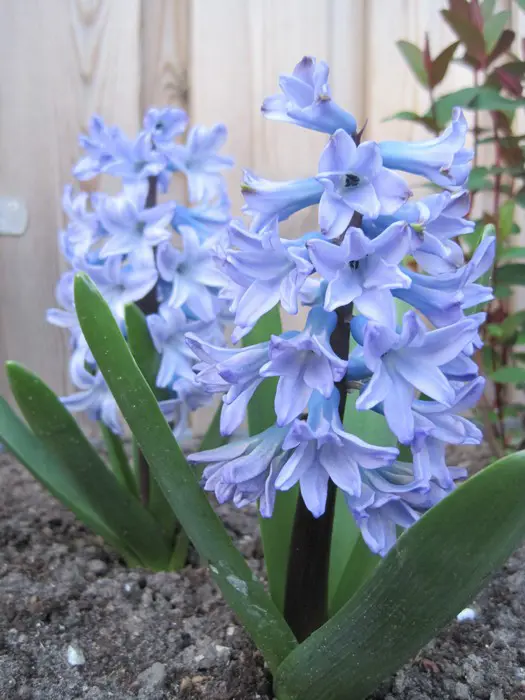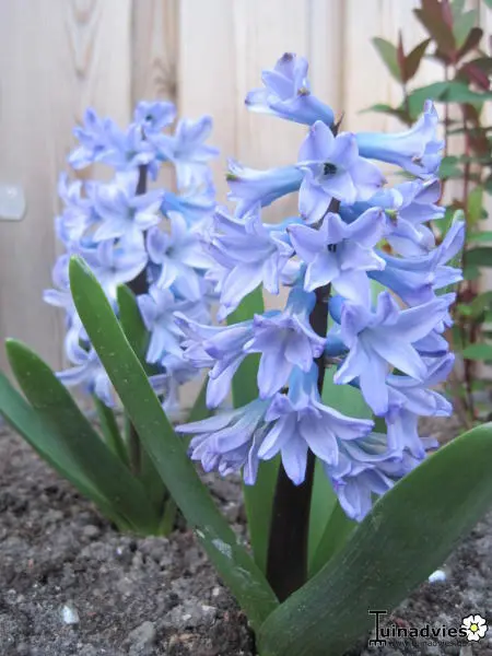 Hyacinthus orientalis 'Blue eyes' bloeit lichtblauw.