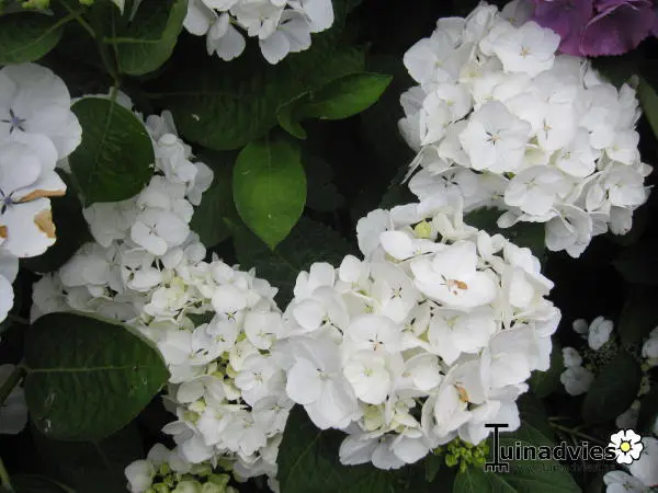 Hydrangea macrophylla 'Immaculata' is een bossige ronde struik met witte bolvormige bloemen. De bloemen krijgen in het najaar een roze tint.