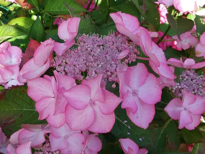 Hydrangea macrophylla 'Sabrina' bloeit met bolvormige schermen van witte bloemen waarvan de randen roze gekleurd zijn.