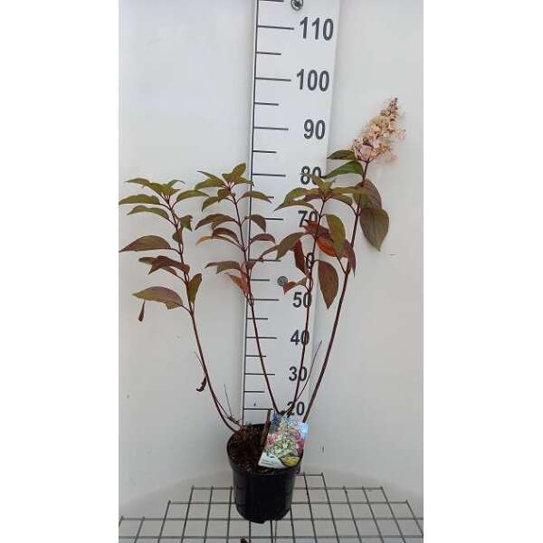 Hydrangea paniculata 'Candlelight' is een compacte struik met rode twijgen waaraan spitse witte bloemtuilen bloeien. Later in de zomer kleuren de bloemen naar cremegeel.
