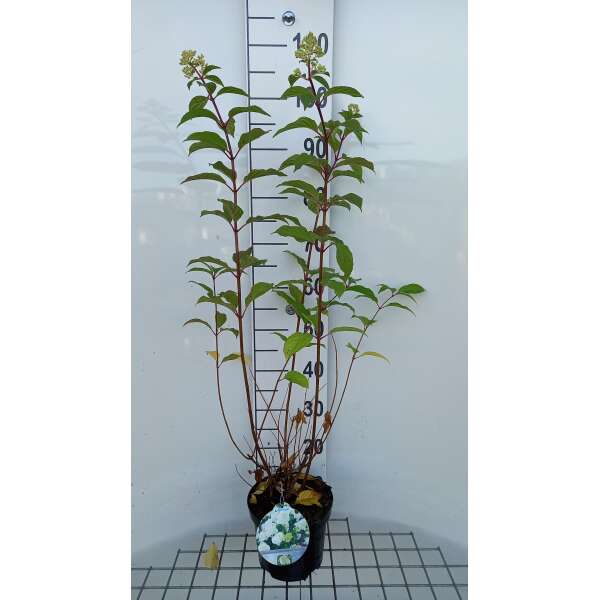 Hydrangea paniculata 'Diamantino' is een rechtop groeiende heester met grote pluimvormige geel/groene pluimen die tot aan begin september doorkleuren naar spierwit om tot slot uit te bloeien met roze.