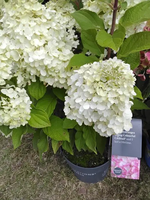 Hydrangea paniculata 'LIVING Colourful Cocktail' met kegelvormige bloemtrossen. In de loop van het seizoen verkleuren de bloemen van crèmewit naar donkerroze.