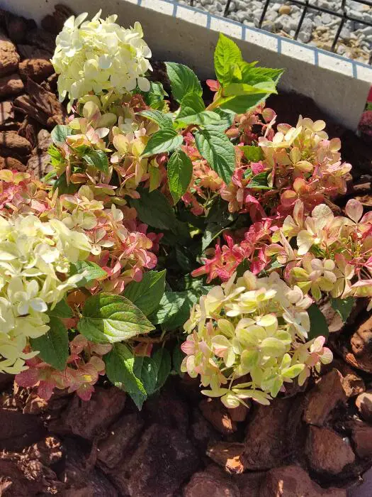 Hydrangea paniculata PETITE Star' bloeit limoen/wit, verkleurt roze in de nazomer tot rood in het najaar.