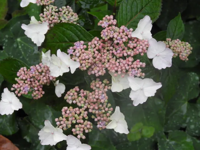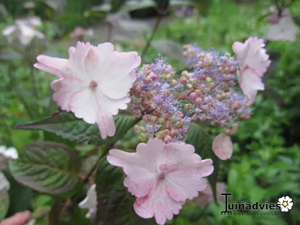 Hydrangea serrata 'Intermedia' heeft platte schermvormige bloemen. Bloeien wit verkleurend naar roze of lichtblauw. Door de zuurtegraad en aluminium in de grond of behandeling met aluin verkleuren ze blauw.