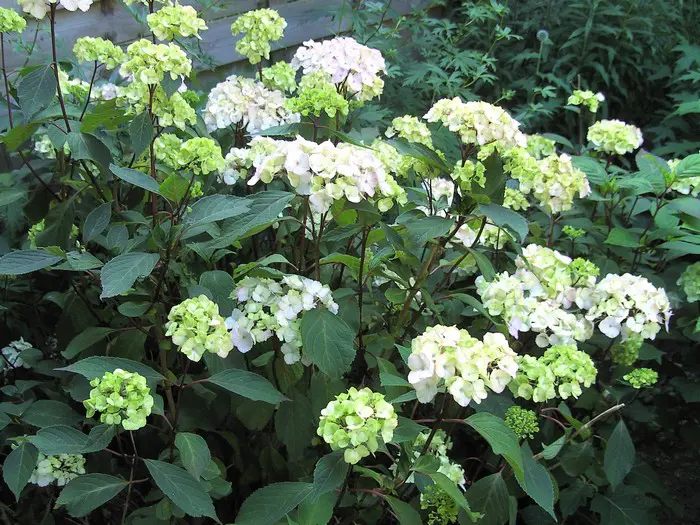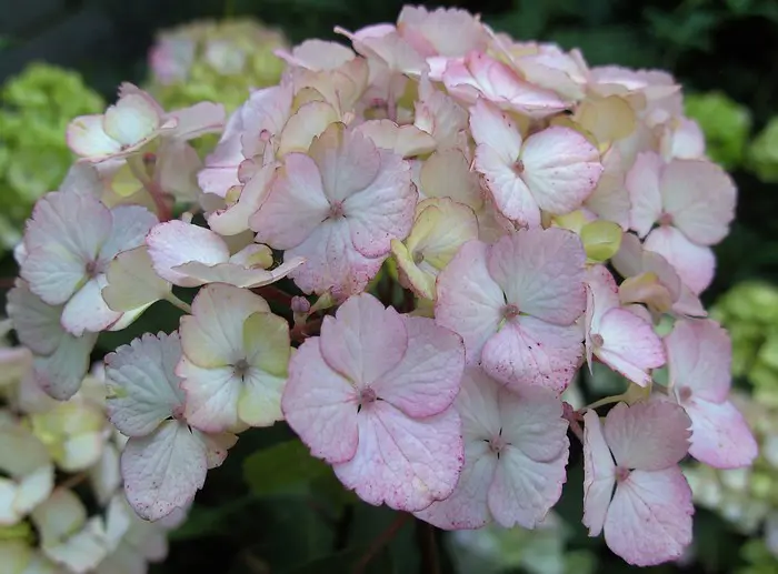 Hydrangea serrata 'Preziosa' bloeit met op floks lijkende bloemen.
